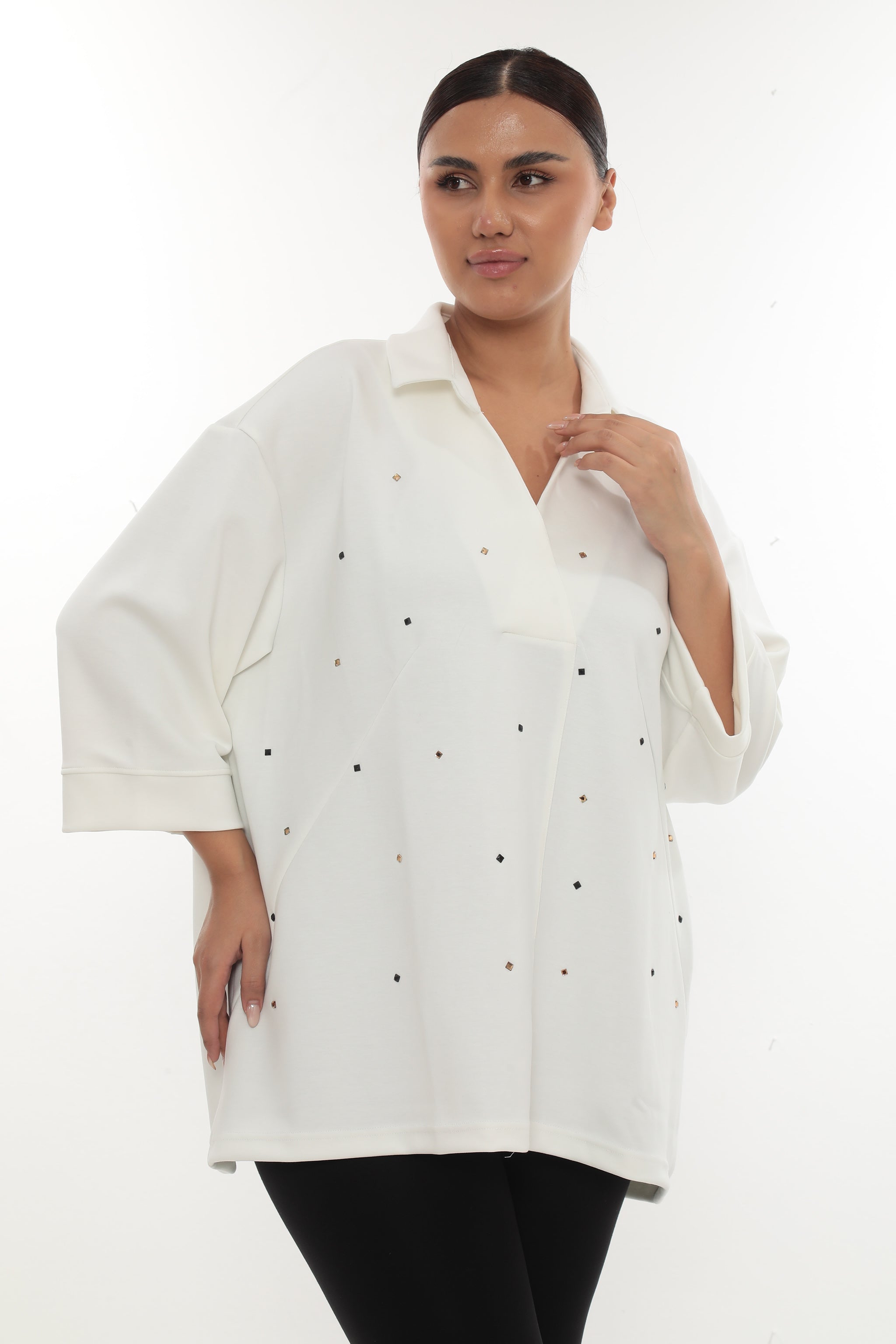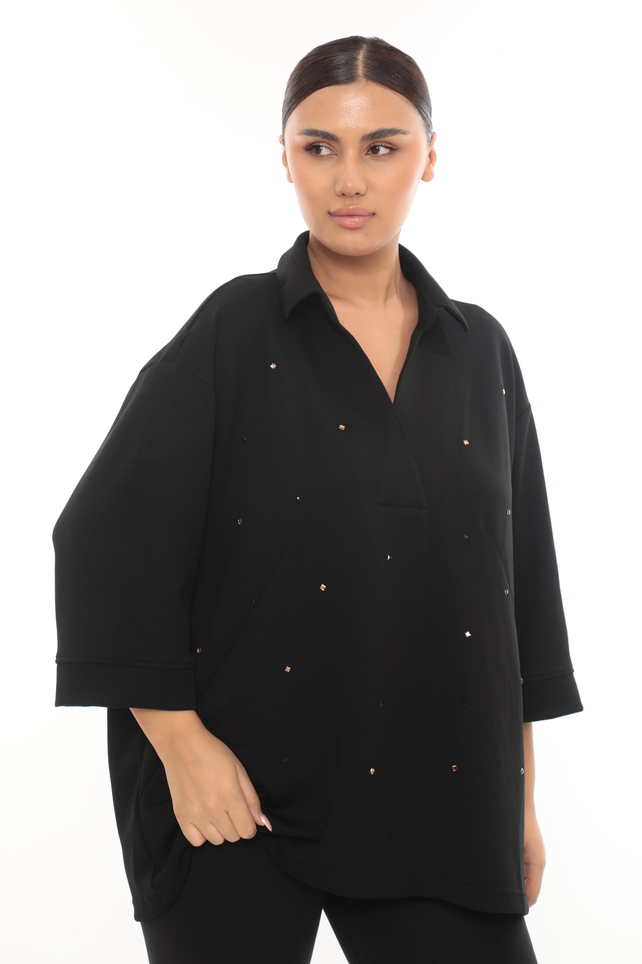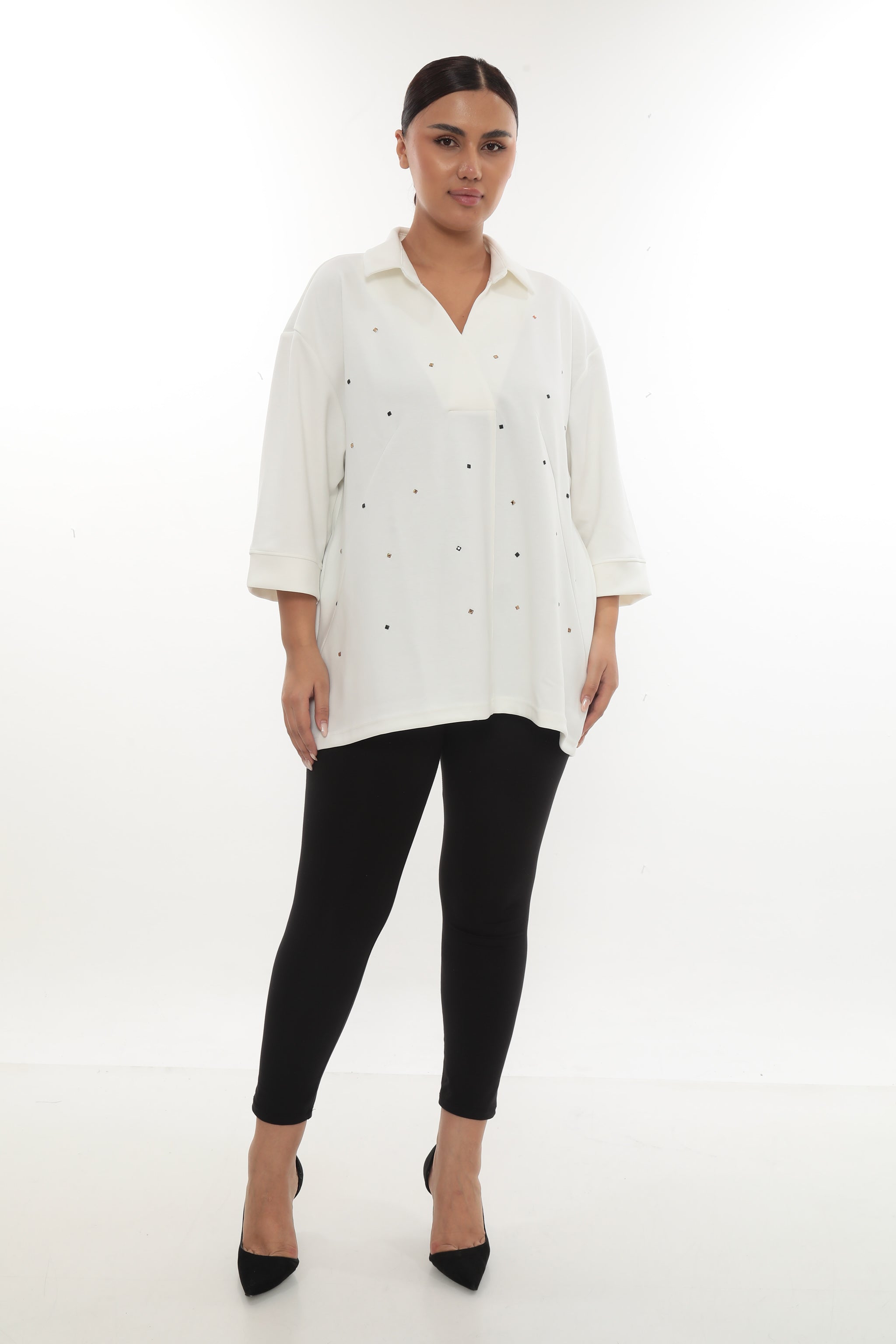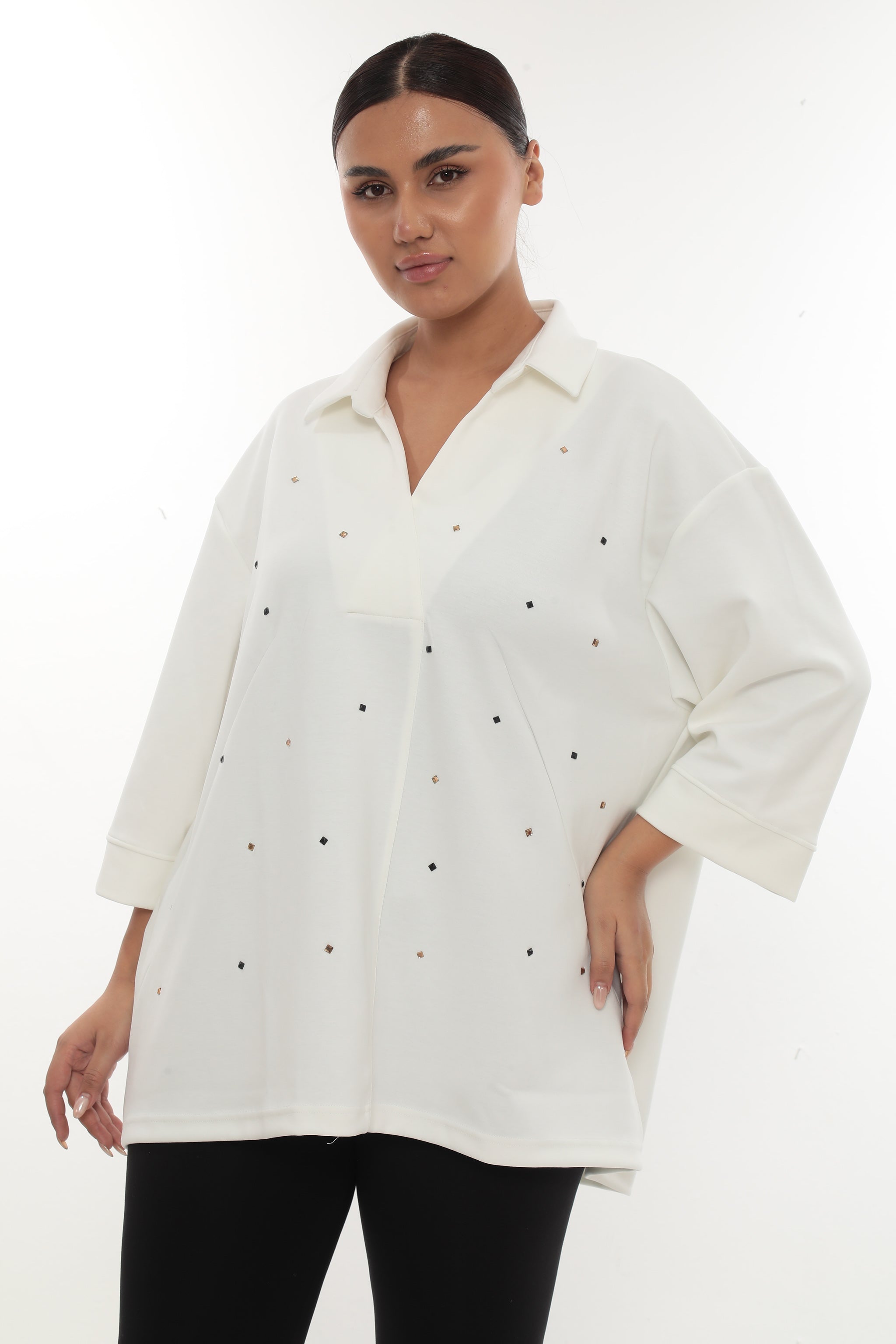 Dámská oversize mikina s košilovým límečkem a kamínky