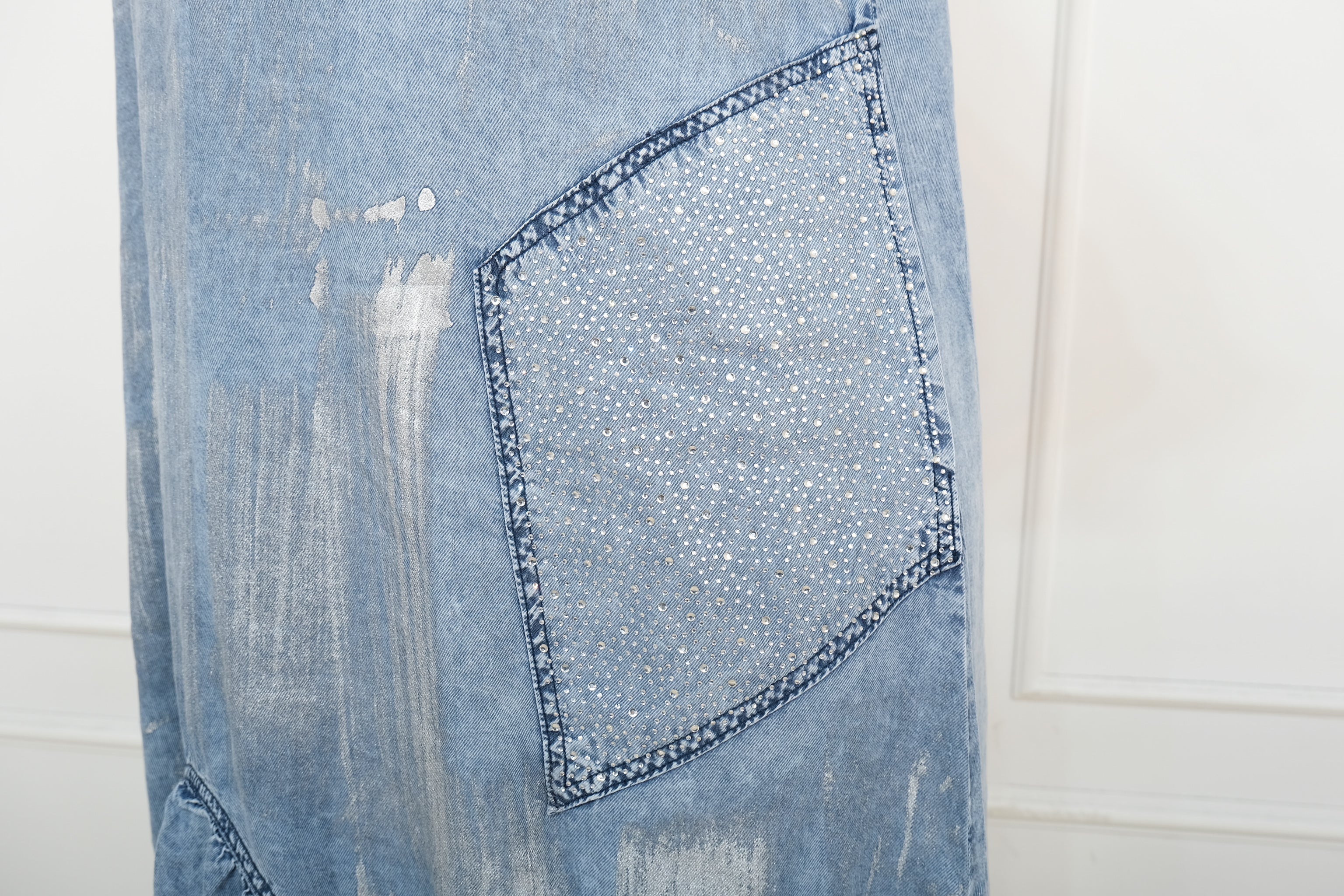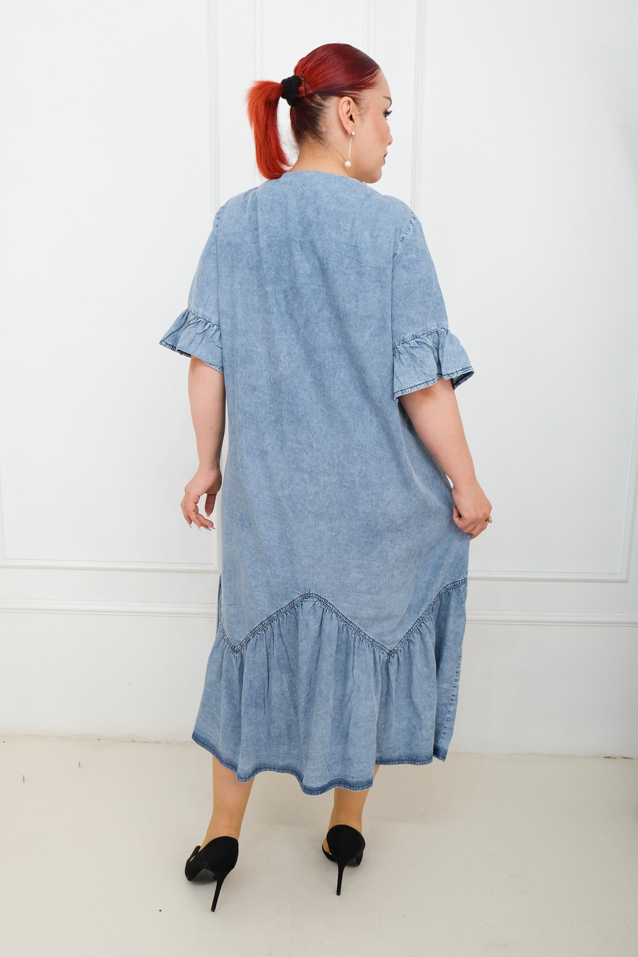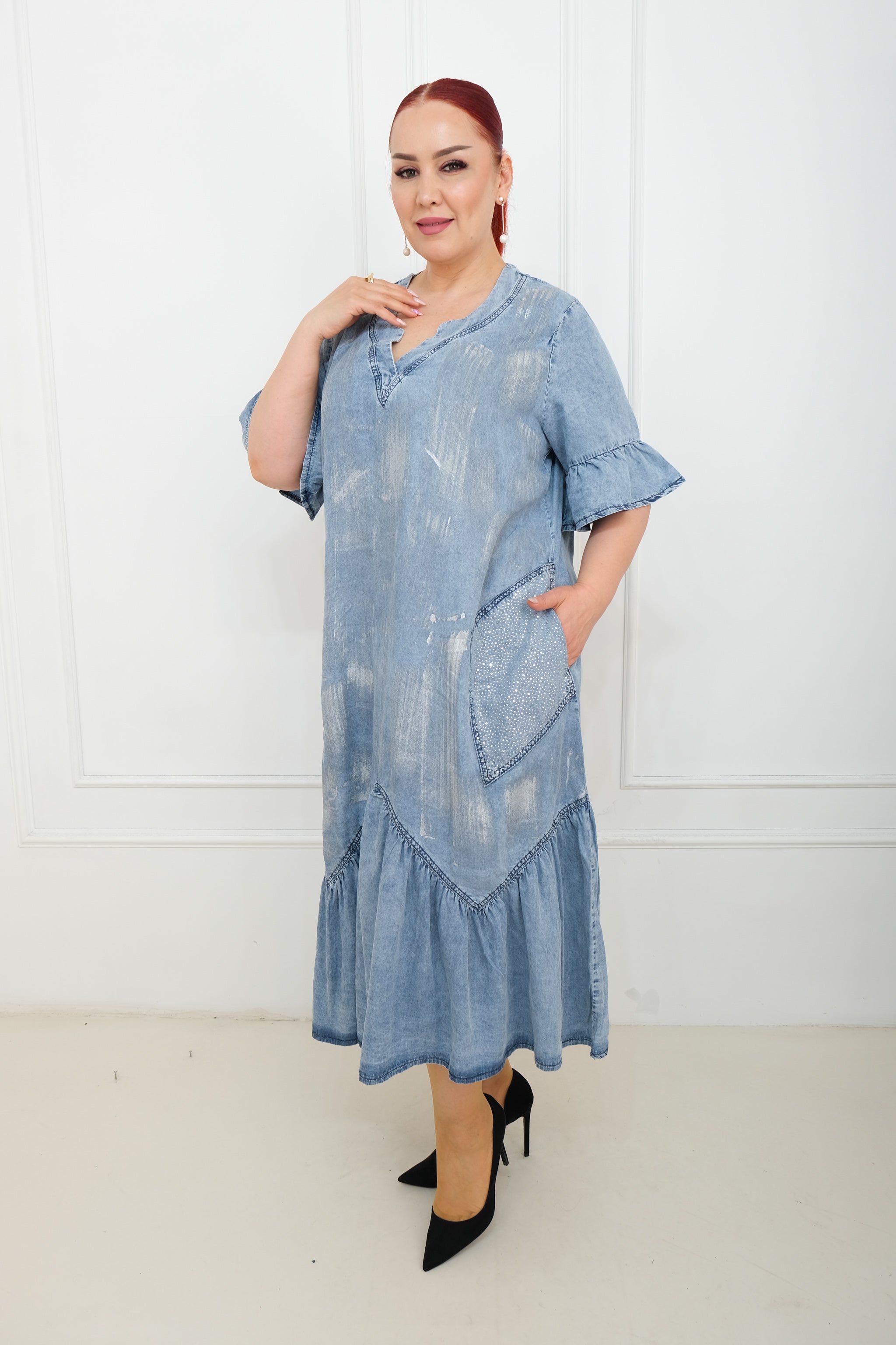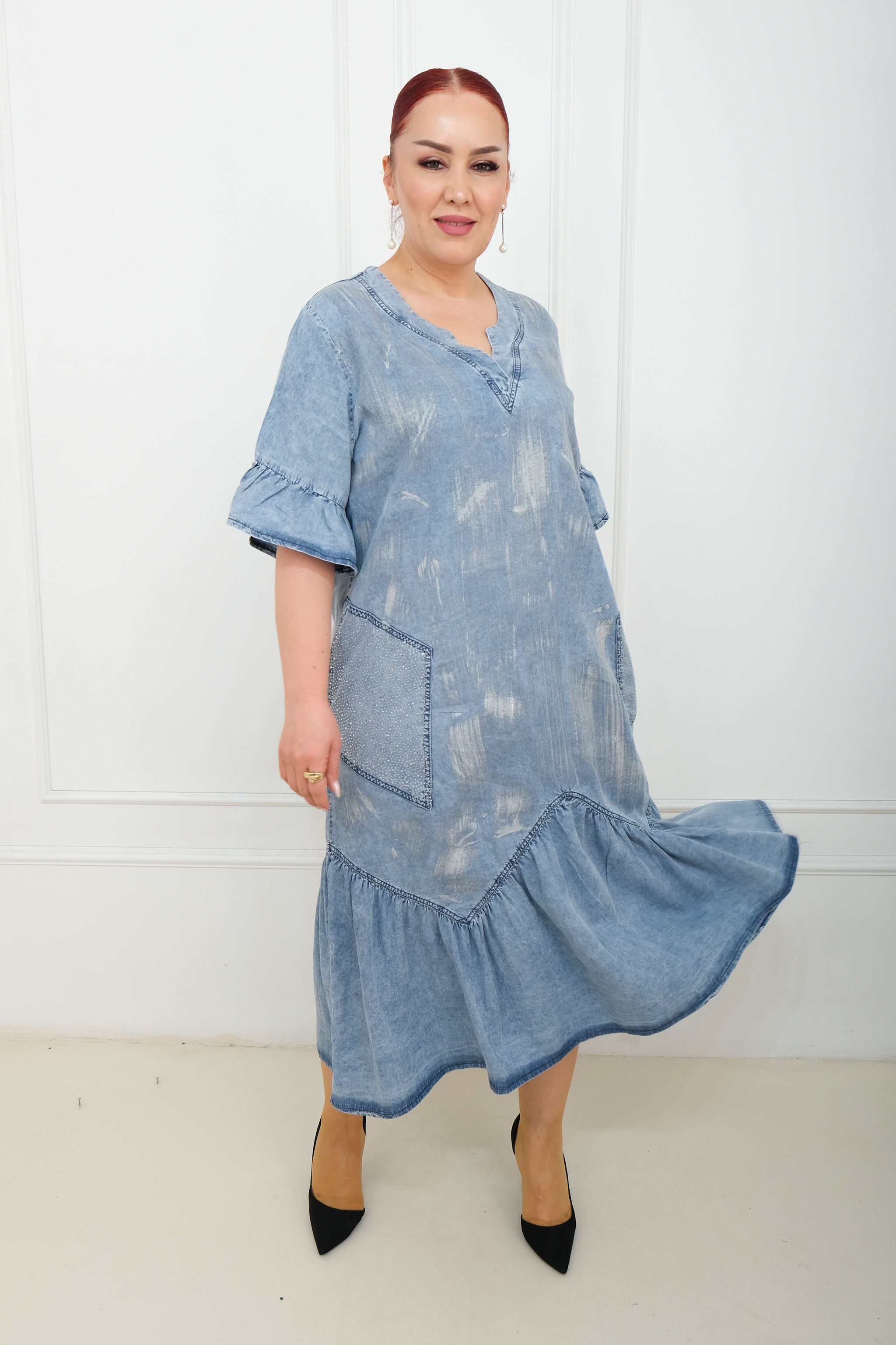 Džínové šaty s nařaseným šarmem