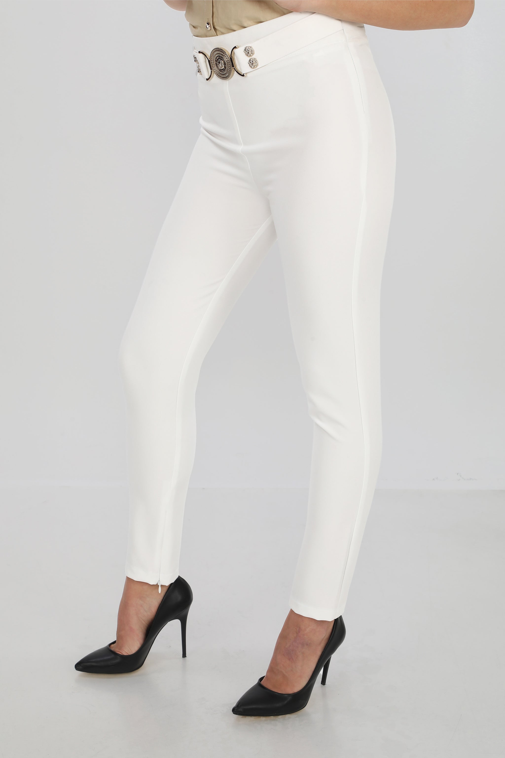 Elegantní kalhoty s ozdobným páskem - bílé/černé
